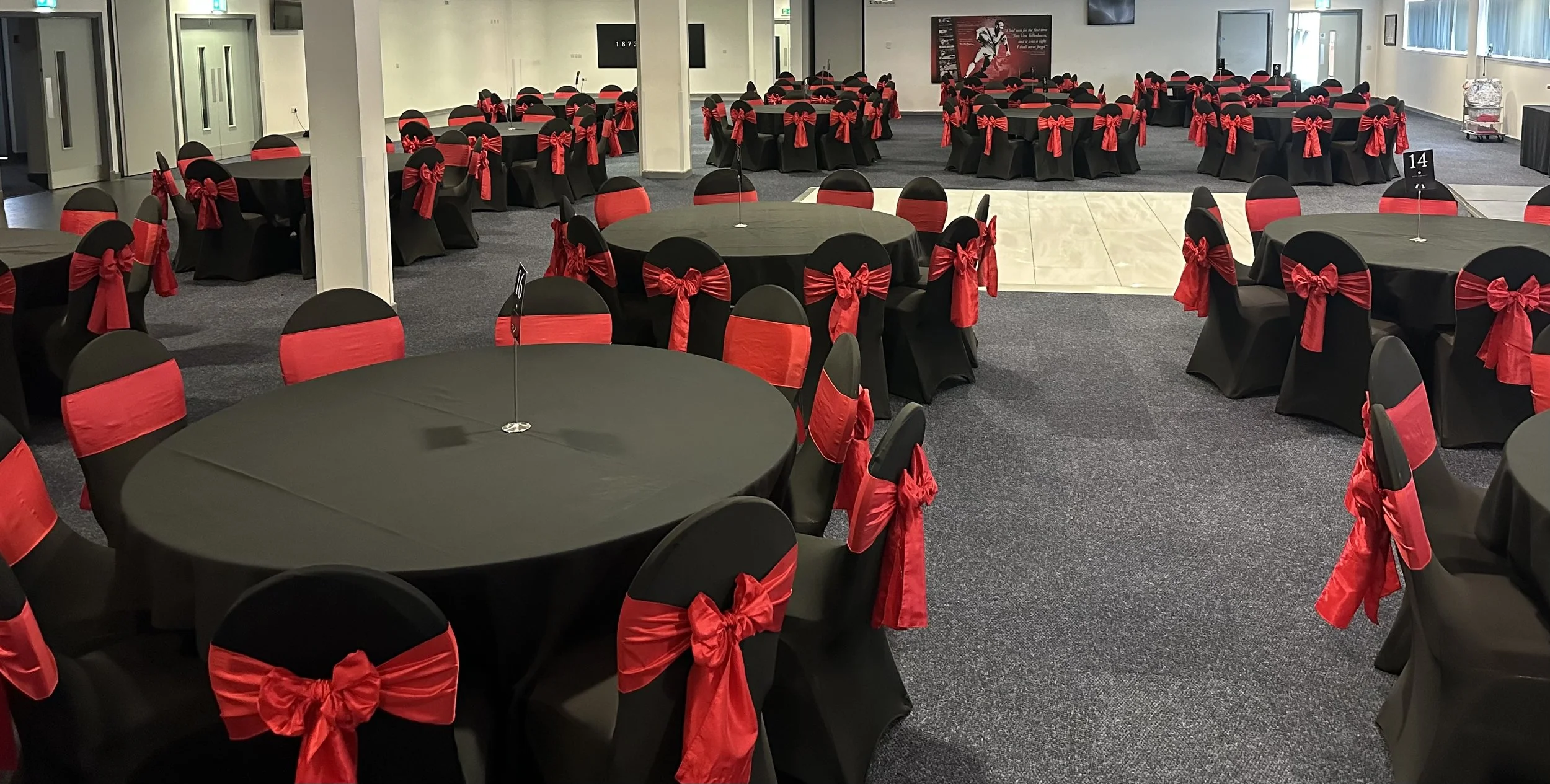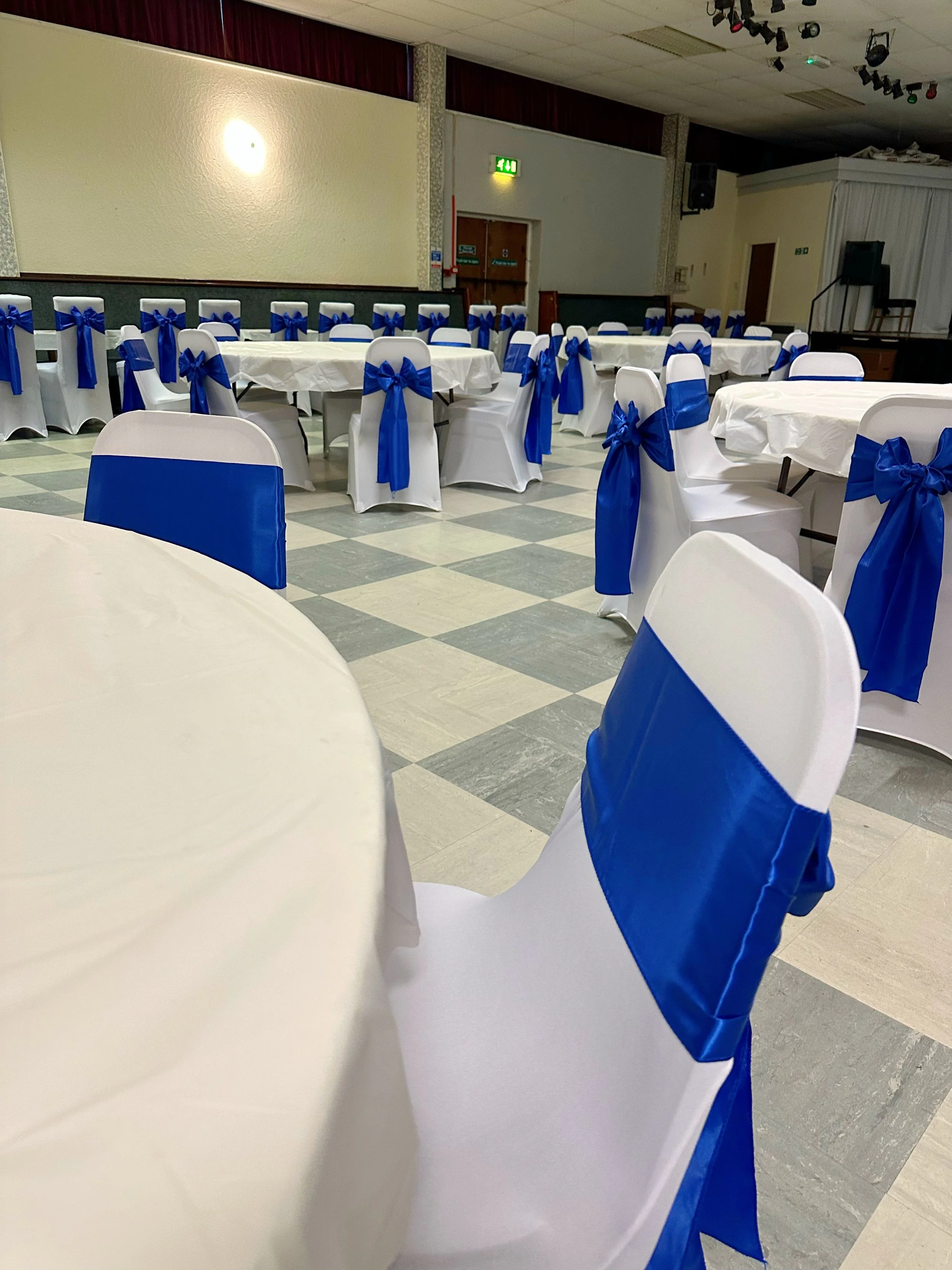 Our chair cover hire starts from just £1.40 per chair, offering an affordable yet luxurious touch for any occasion. We have black and white chair covers with various coloured sashes.